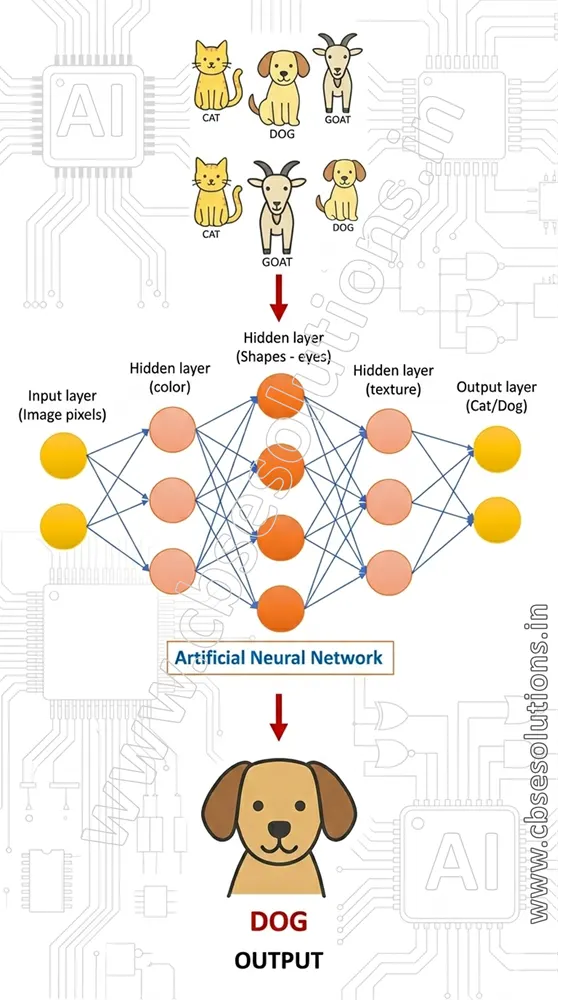 - INPUT Layer – You give it data: pictures of dog, cat and goat, along with their names.