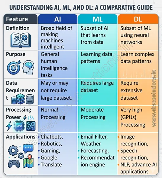 - Deep Learning (DL), a subset of Machine Learning, uses artificial neural networks inspired by the human brain.