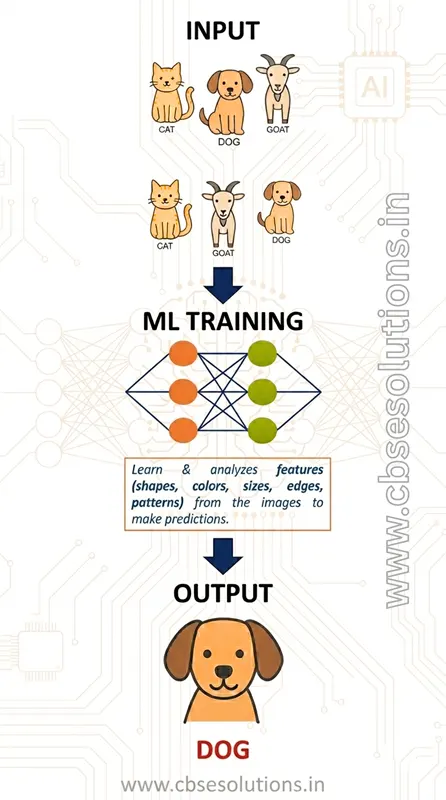 - ML training – The computer studies the patterns (like shapes of ears, nose, or size) and learns to identify them.